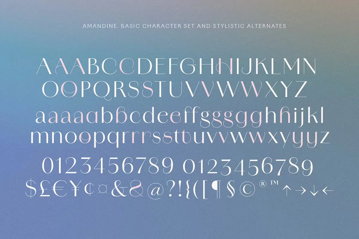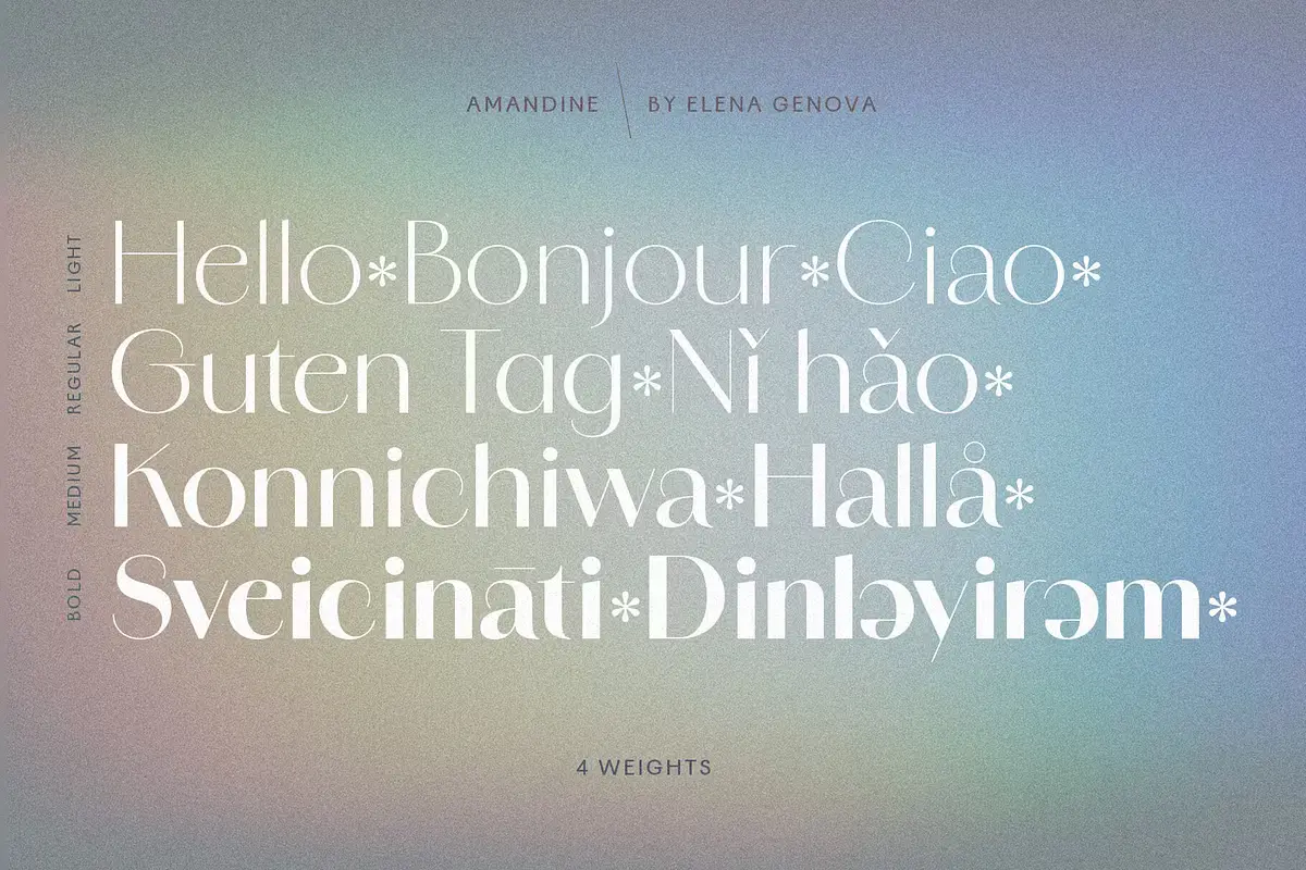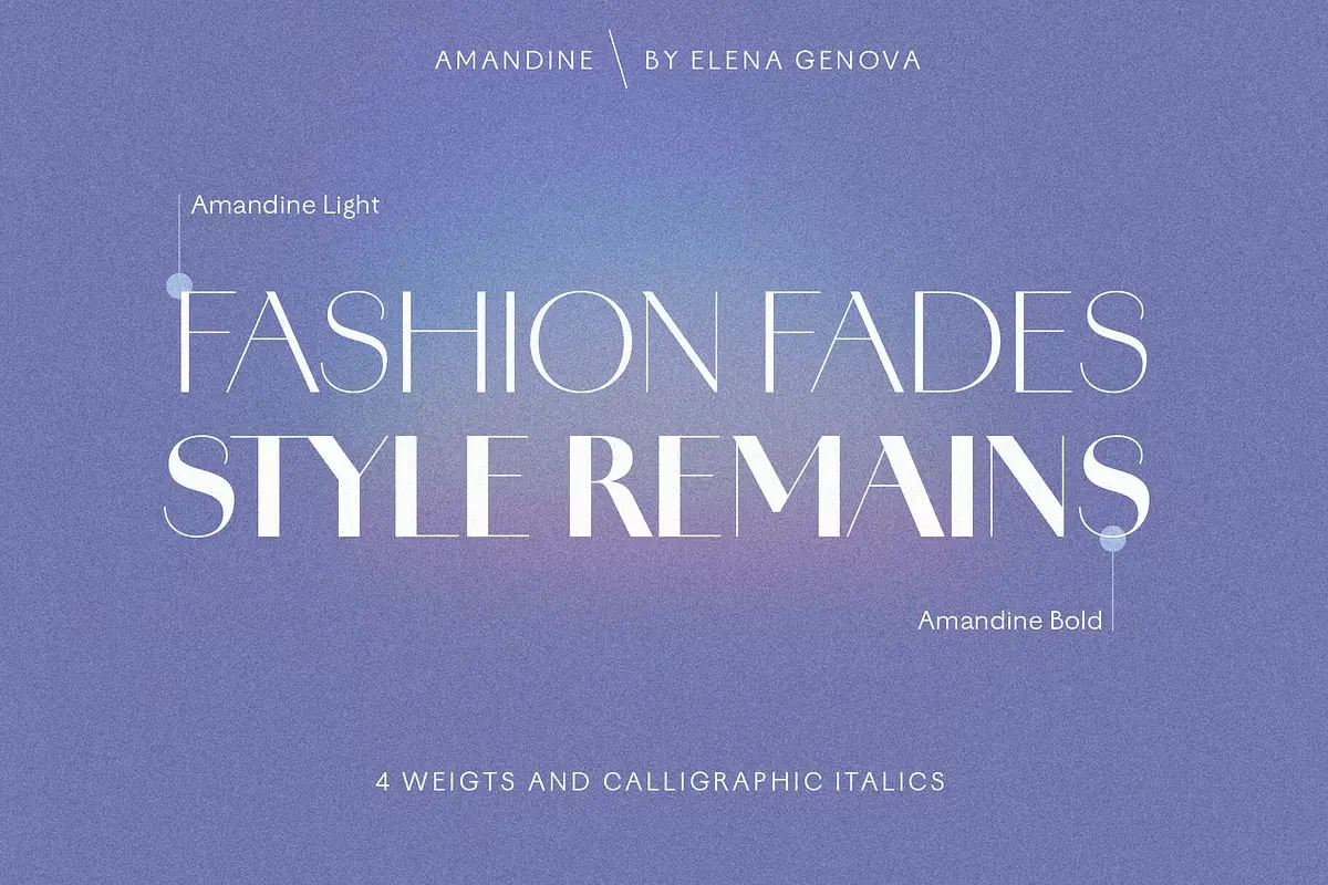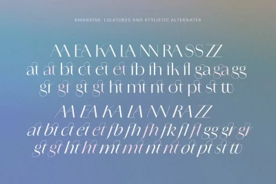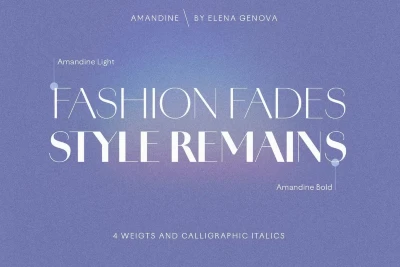 Amandine is a modern high-contrast sans family inspired by Didone forms, vintage typefaces, and calligraphic scripts. The typefaces share the same signature curves, but the italics are original and delightfully unexpected. Their utility is only enhanced with stylistic alternates, ligatures, and swashes, making each use a little less off-the-rack. Its elegant design is well suited for the design of luxury brands, magazines, book covers, wedding invitations and stationery, packaging, and more.