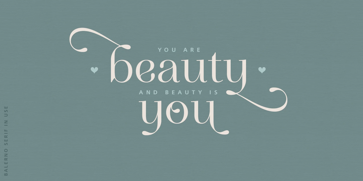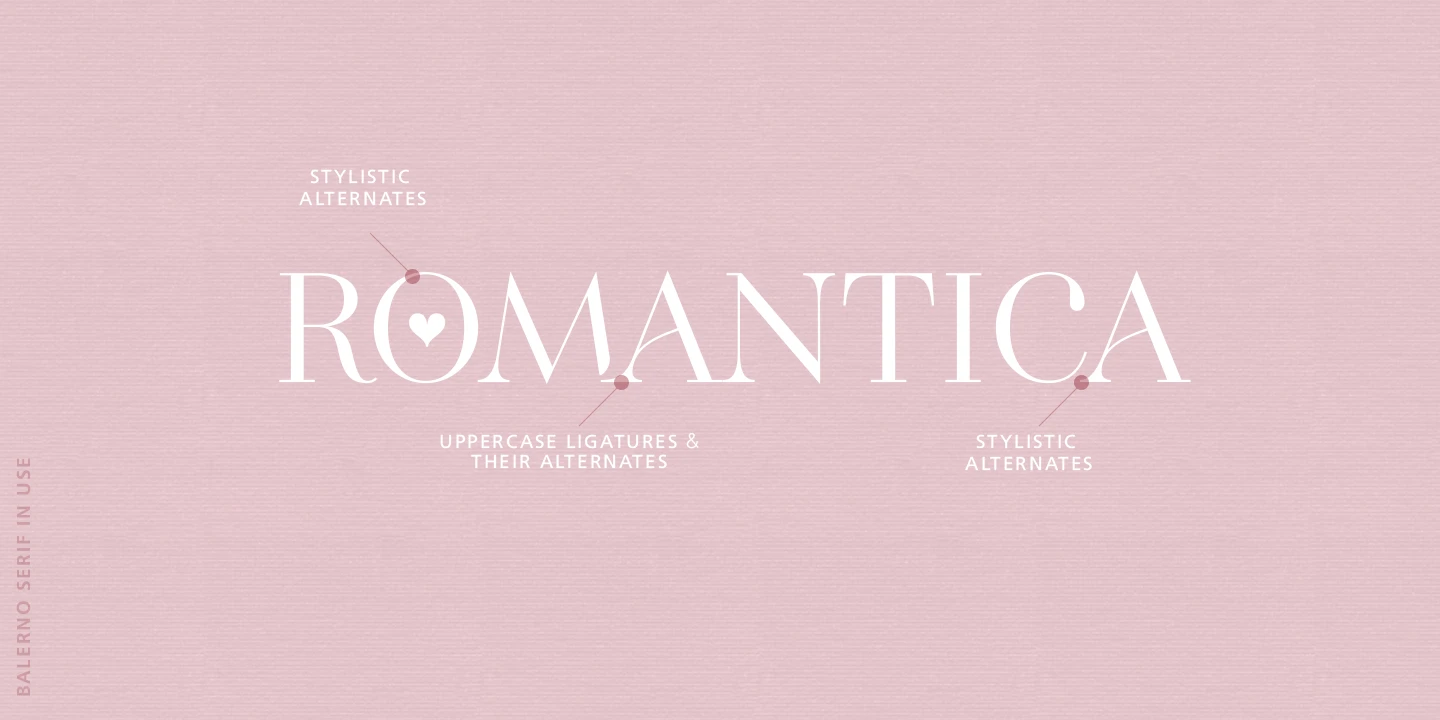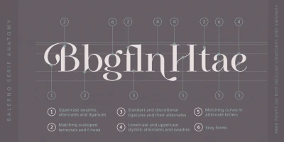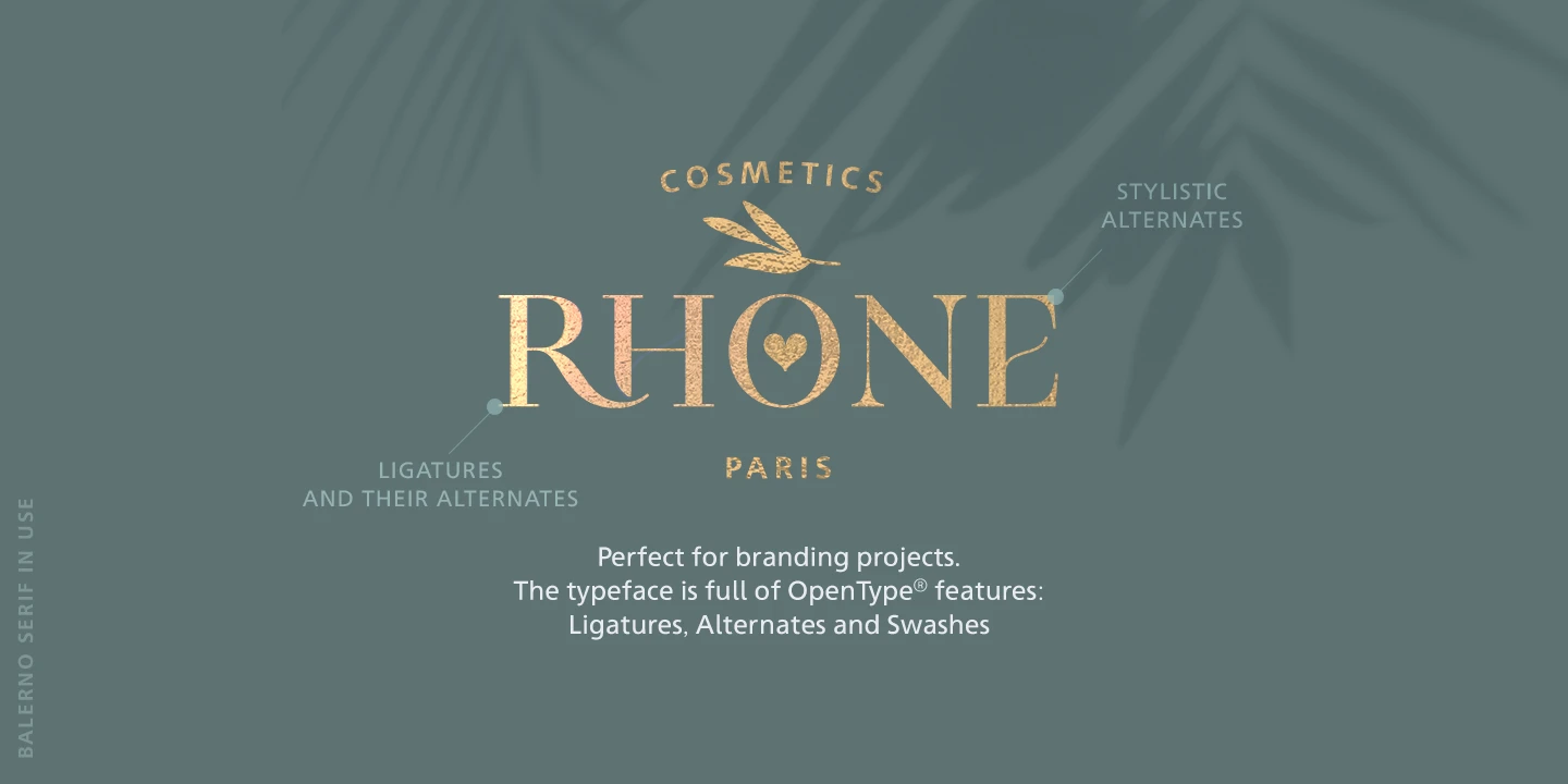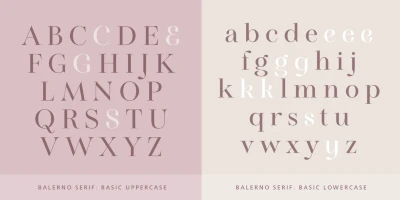 Balerno is an elegantly modern Didone serif with a twist. The added enhancement of ligatures, alternates, and swashes adds versatility beyond the genre and opens up the family to other possibilities. This family could gracefully add panache to a wide range of design projects, from seasonal greeting cards, fashion magazines, wedding invitations, skincare websites, social media branding, and more.
