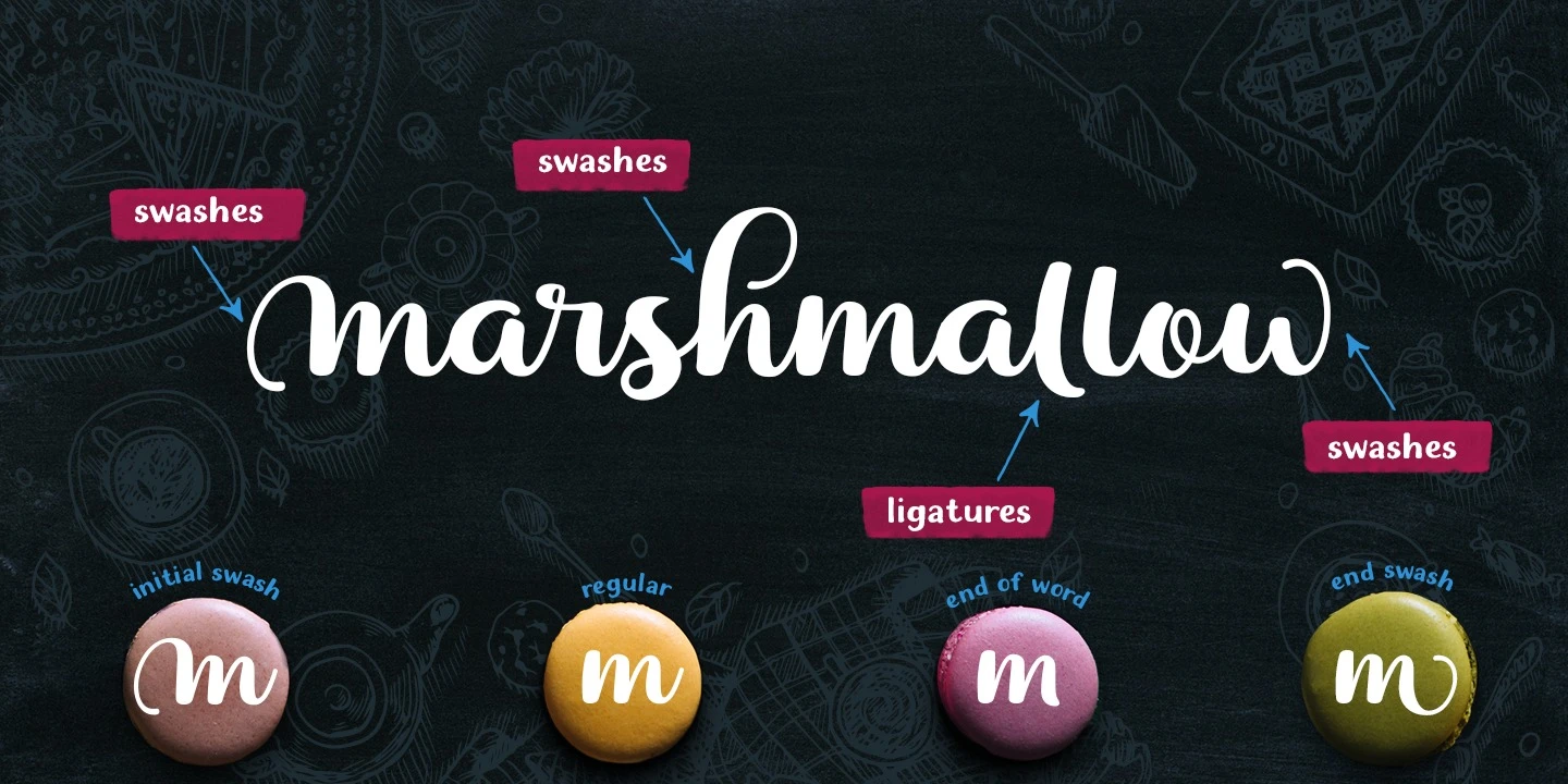 Dessert Menu Sans is a 100% handmade brush-style design. Each letter was carefully traced by hand to keep the authenticity of hand-lettering alive in your projects. It is not only adorable, but it is also readable — use it in text sizes and display sizes! Because of the squat skeleton, you can use the caps as small caps for the Dessert Menu Script or as a text companion. Don’t miss the handful of alternates and catchphrases for adding even more detail to your typographic work.