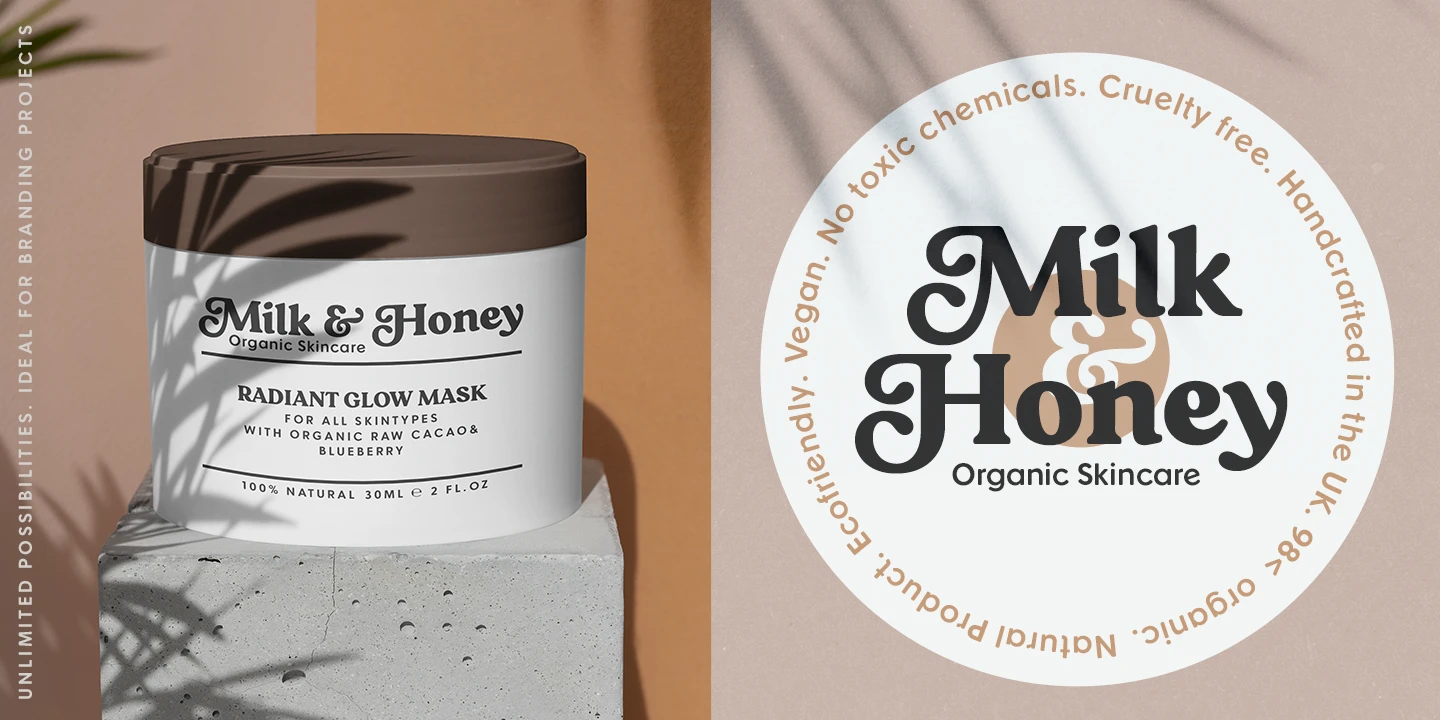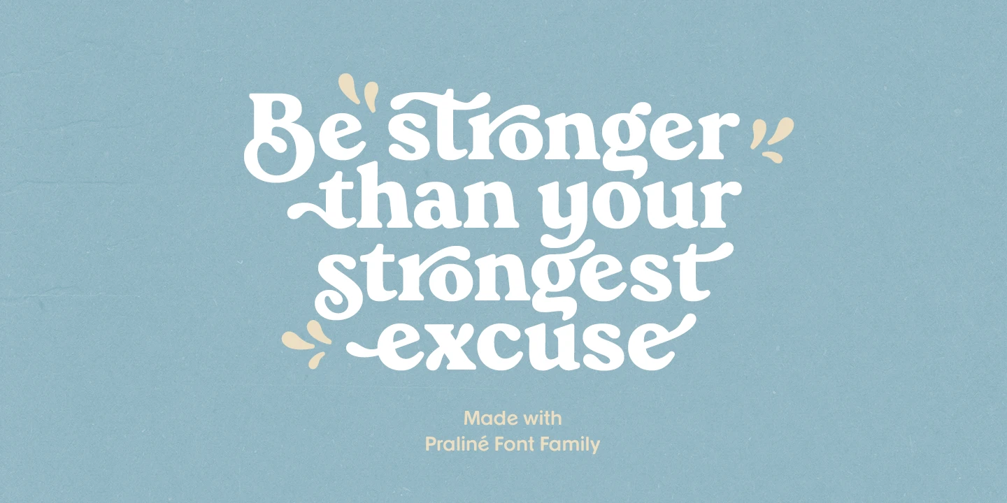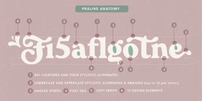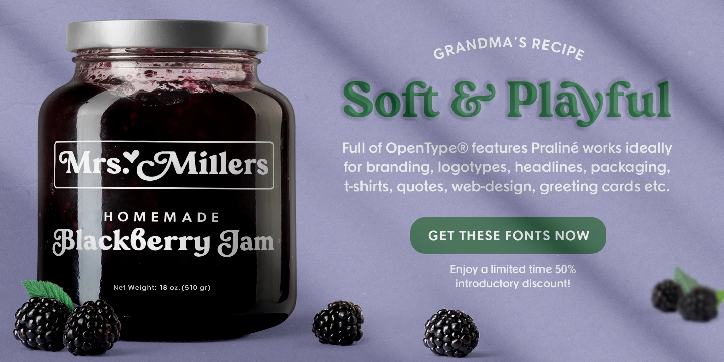 Praline is a font family that contains two fonts — the perfect pairing — a vintage soft serif and a sans serif with corresponding forms and softness. Serif: Grandma’s sweet and soft recipe with more than 1300 ingredients (lots of alternates, swashes, ligatures, and design elements). This font takes its inspiration from Goudy, Windsor, and Bookman typefaces. Sans serif: Soft and friendly, it is a simple 1970s-inspired grotesque to use as a support font with Praliné Serif or any other serif or script font of your choice. Get your designs to look like the 1970s!