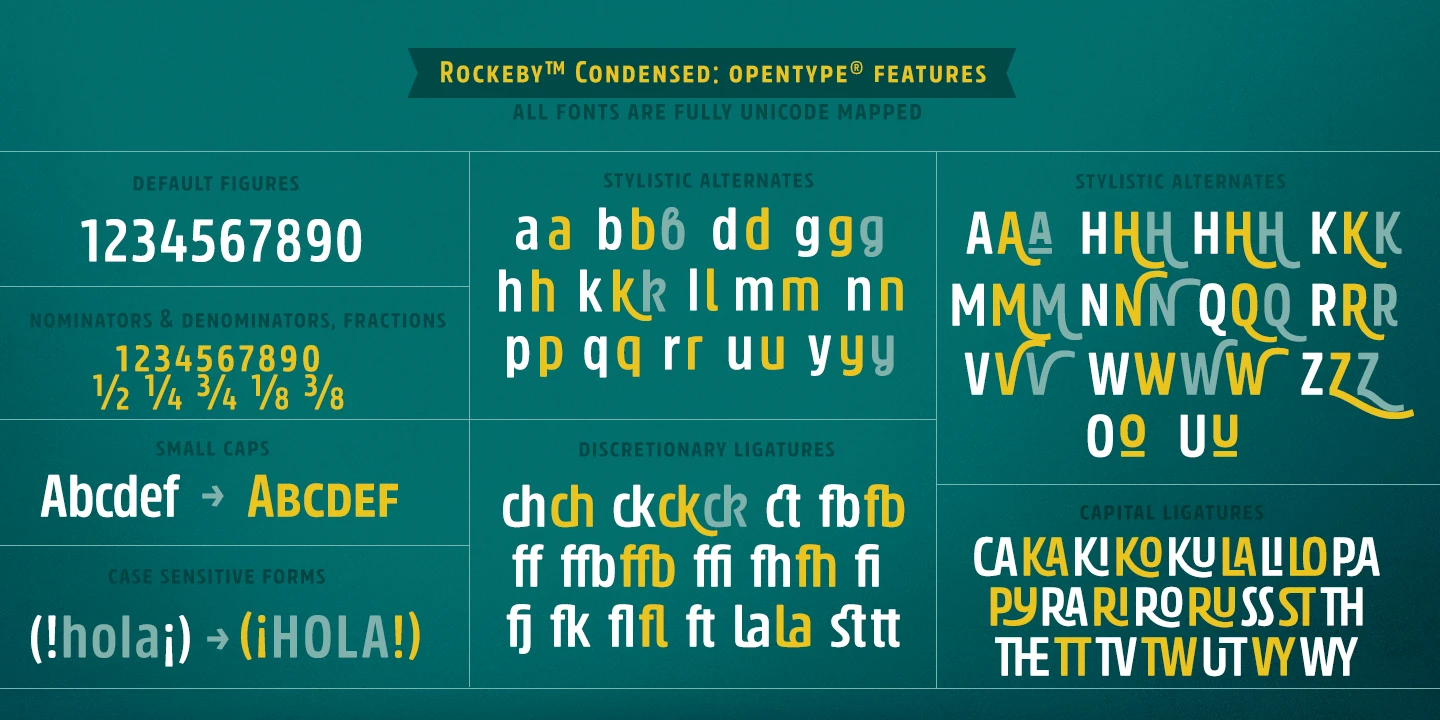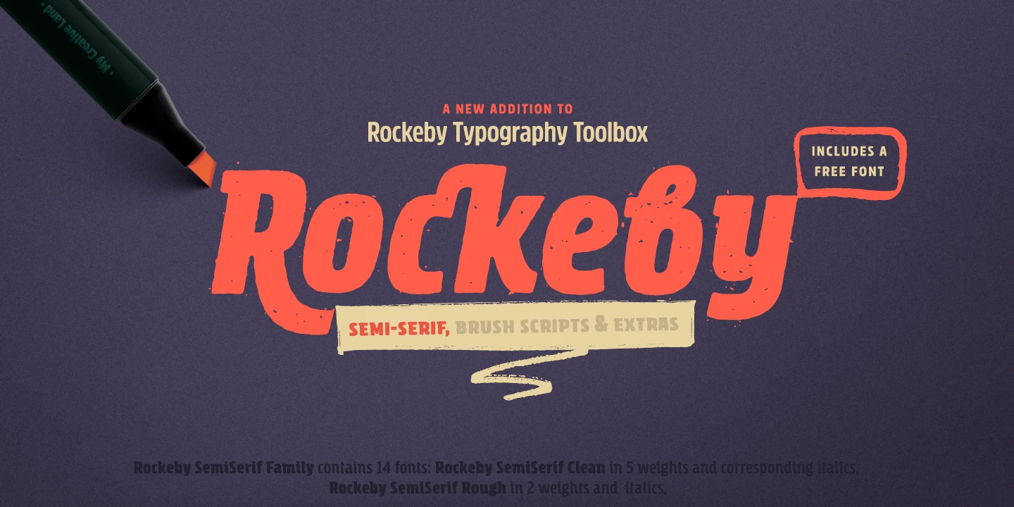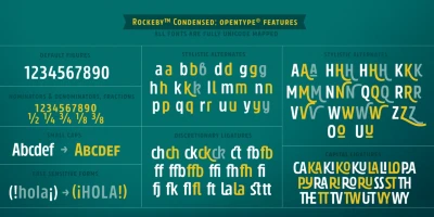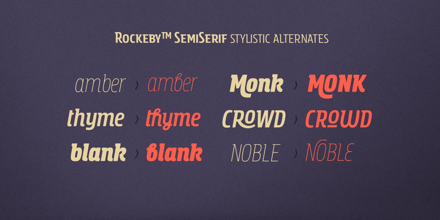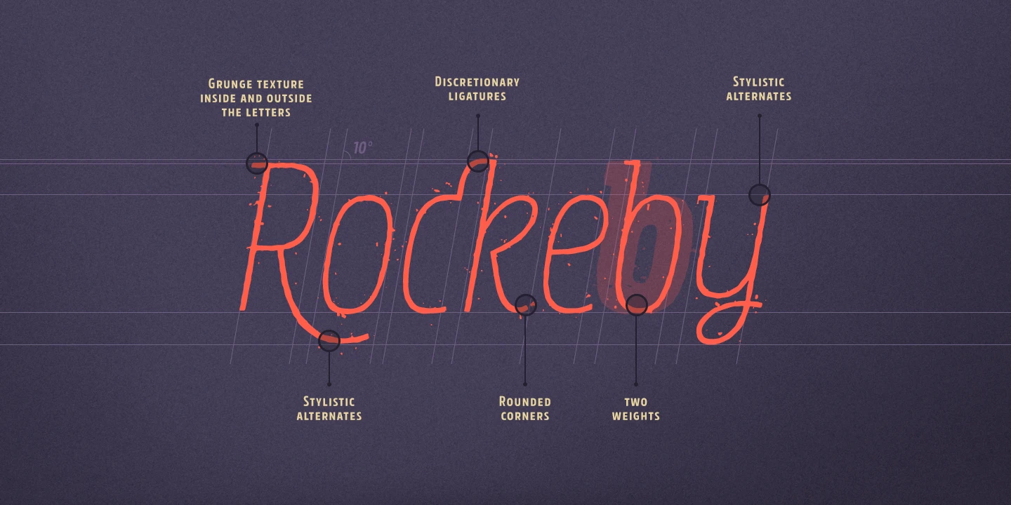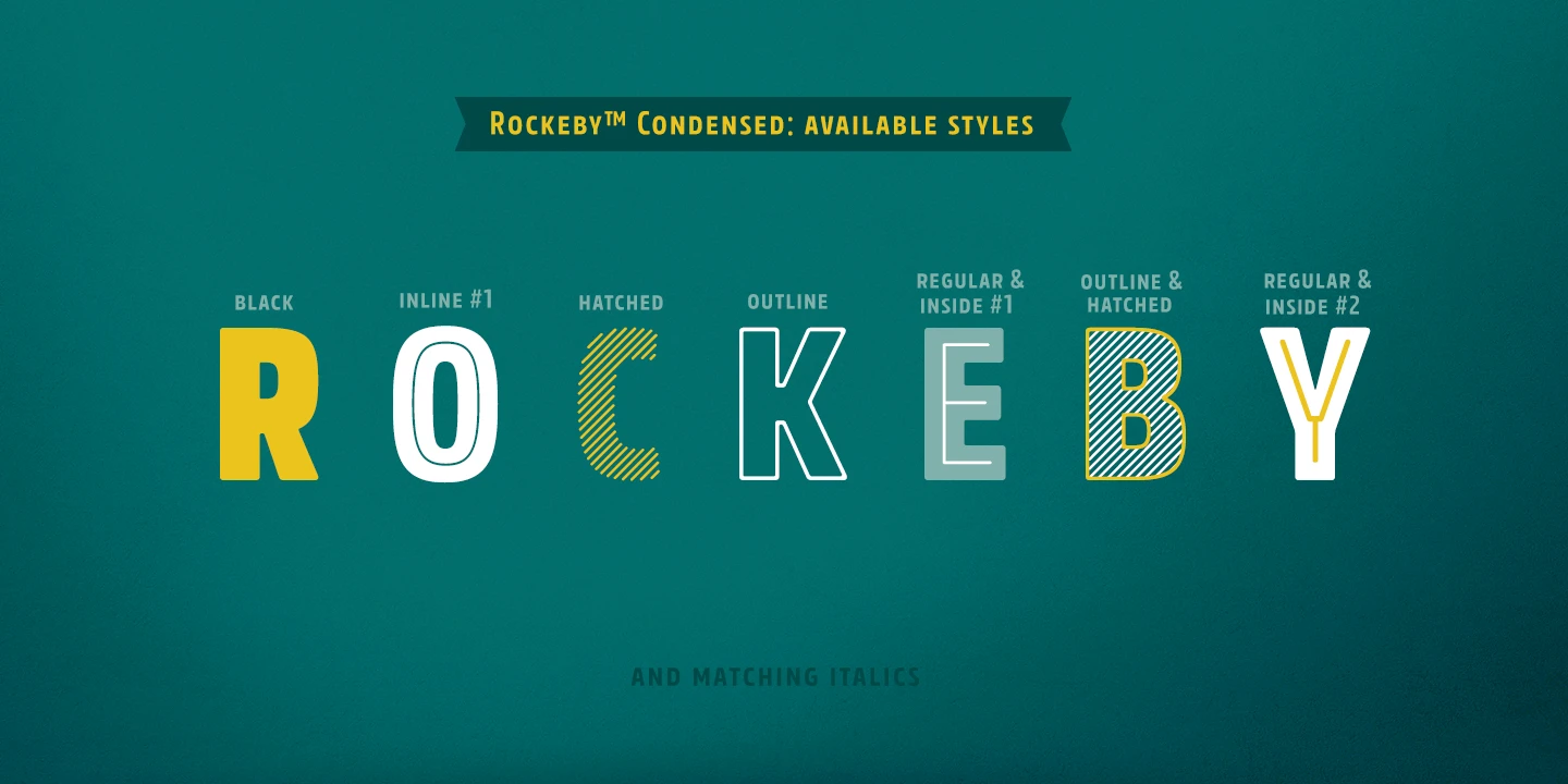 Please welcome the new grotesque family; slightly more geometric than Block Berthold but much softer than the industrial Din Next, Rockeby includes a lot of stylistic alternates and ligatures to help add character to any type of design. The slightly curved diagonal strokes give the sans serif fonts its unique personality and soft look. Even more - the family has two scripts (4 weights each) which will enhance the design even more. Combining italic with the script has never been easier - they both have the same italic angle. These scripts also benefit from contextual alternates, swashes and ligatures. And last but not least, the family also includes Extras fonts (which also have 4 weights) which can further enhance any design you are creating.