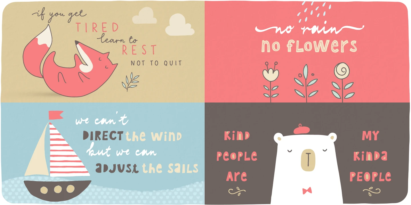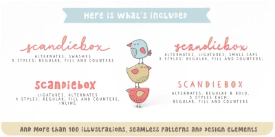It’s time to have some fun! The Scandiebox Handlettering Collection was inspired by simplicity of the modern Scandinavian style and also have some influence of Japanese kawaii. All handwritten fonts in this collection perfectly compliment each other as well as the set of more than 100 illustrations created in the same happy style. The collection’s childish look-and-feel makes it perfect for all sorts of designs for children - books, cards, invitations, packaging, apparel, children shop ads, etc.